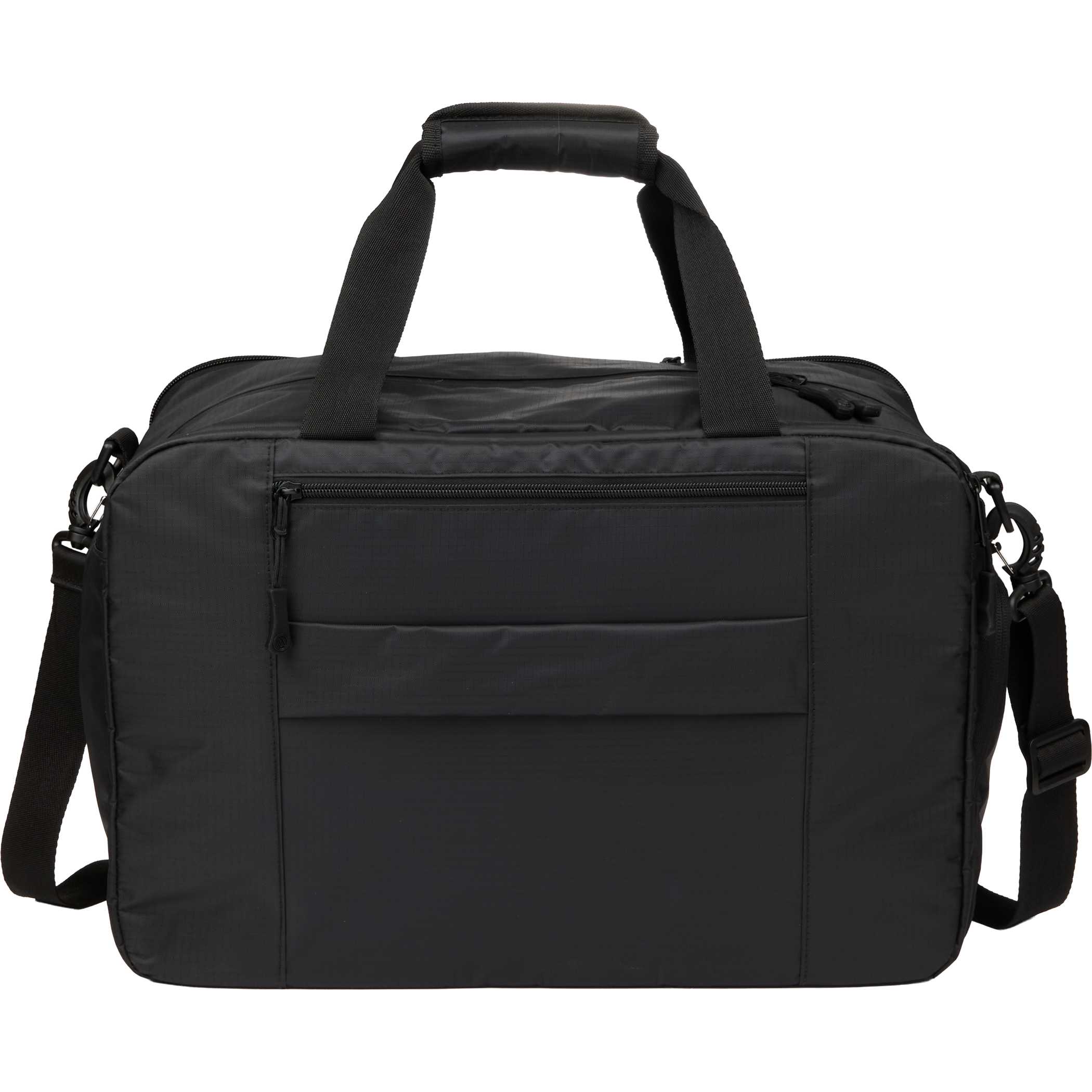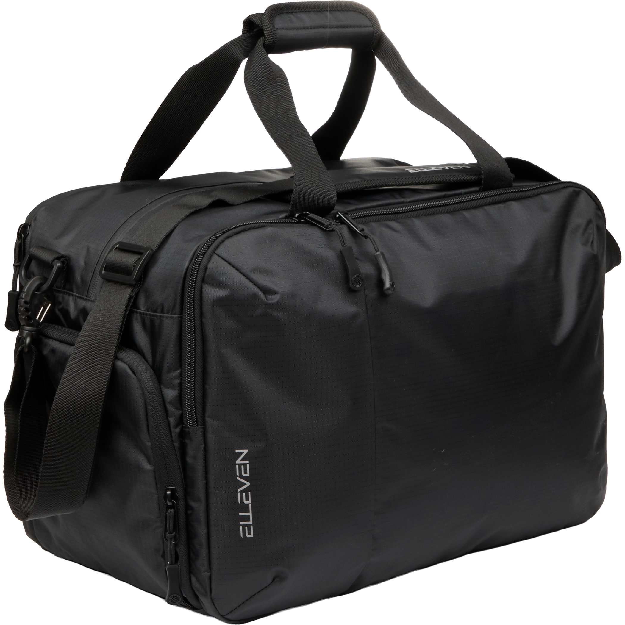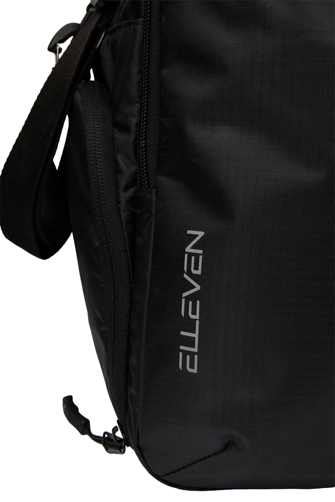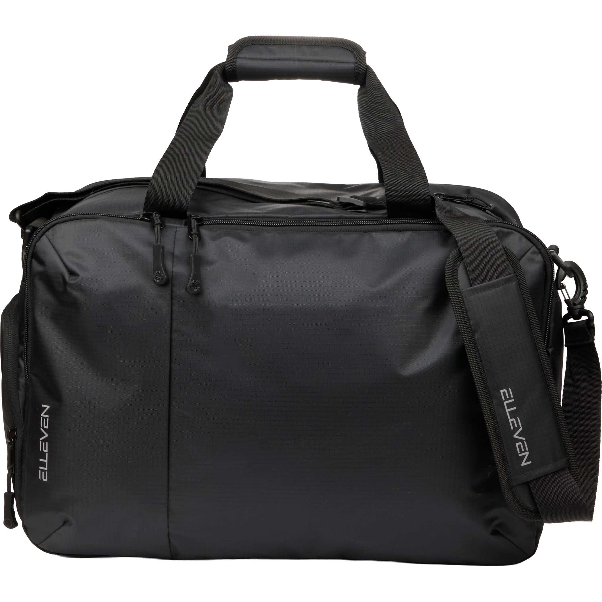 The Elleven Zenith Duffle is the ultimate travel companion, designed to keep your essentials secure and accessible. The front features a larger pocket with organization inside, along with a smaller pocket on the left that can hold water bottles. This duffle is also a great essential with its built in shoe pocket that will keep your shoes separate from other items. Store your laptop with its padded pocket, and this bag also features a trolley sleeve. Made with recycled materials, it will keep you. 10″ D x 17.5″ W x 11.75″ H